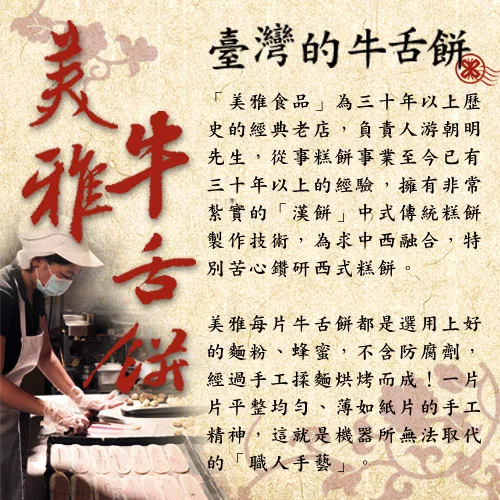 傳承最道地的傳統口味與專業的職人精神,每片手工牛舌餅,都是累積三十的經典傑作。